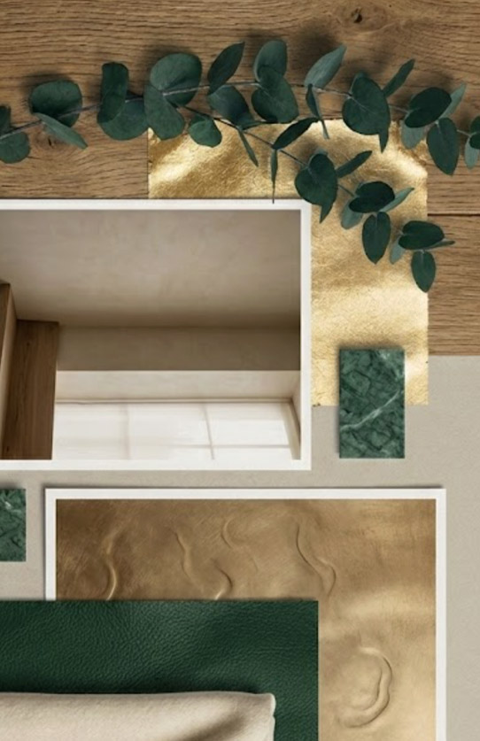 * subtle contrasts between raw, natural surfaces and refined gold finishes