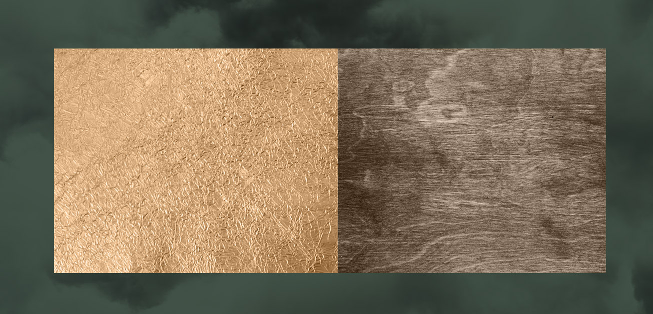 * texture-led visual language built around wood, gold foil, and organic surfaces
